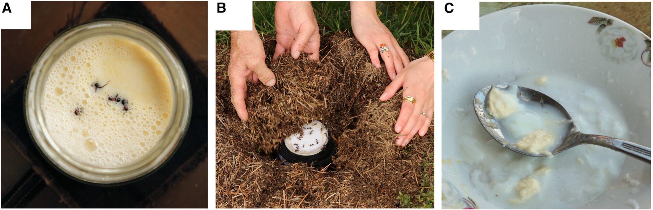 The process of making ant yogurt, from Veronica Sinotte's experiments: A) Live ants added to warm milk; B) the inoculated milk being buried in the ant colony and left to ferment overnight; C) The result, already beginning to coagulate and increase in acidity. (Photo credit: Sinotte et. al.)