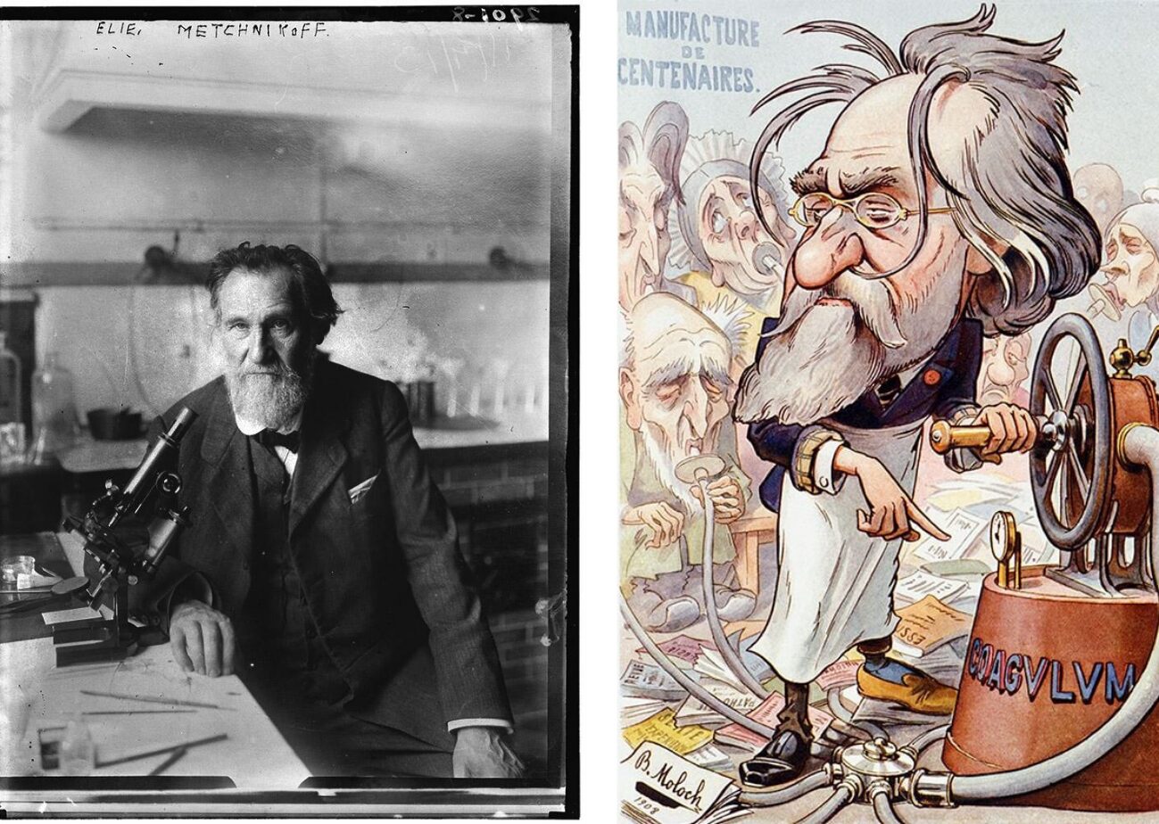 Left, Elie Metchnikoff in the lab, 1910; right, a political cartoon, circa 1908, satirizing Metchnikoff's "cure" for aging. (Photo credits: left, Library of Congress; right, Institut Pasteur - Coll. Musée Pasteur)